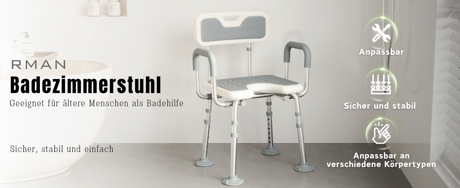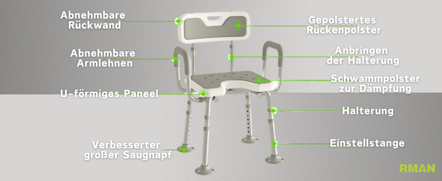 RMAN® Duschhocker mit Abnehmbarer Rückenlehne und Armlehne für Senioren Schwangere 150+KG belastbar Duschstuhl 6-stufige Höhenverstellbar Duschhilfe rutschfeste U-förmige Gummifüßen Duschsitz - Grau