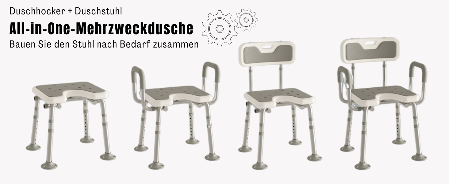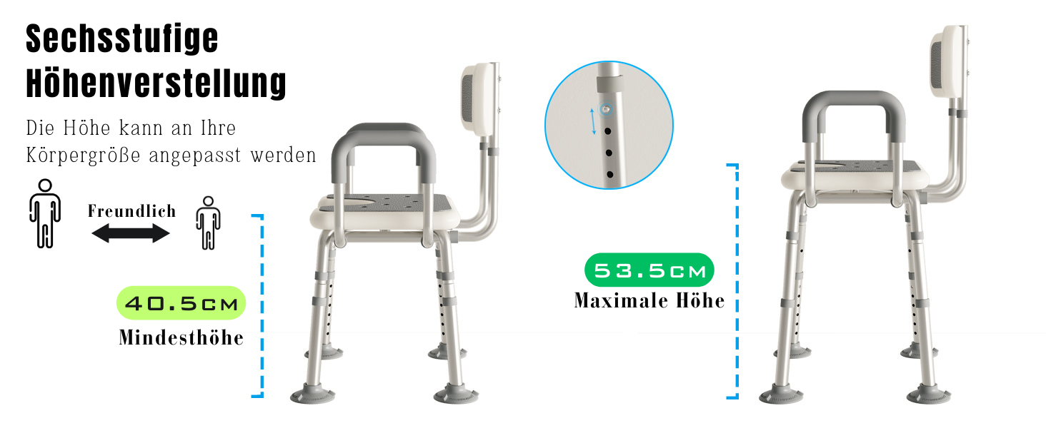 【Freie Konfiguration】Der Duschhocker ist mit abnehmbaren Armlehnen und einer Rückenlehne ausgestattet, die sich flexibel an Ihre persönlichen Bedürfnisse anpassen lassen. Ob Sie volle Unterstützung bevorzugen oder mehr Bewegungsfreiheit wünschen – die Nutzung lässt sich ganz einfach anpassen. Zusätzlich bietet der Stuhl 6 Höhenverstellungen, die sich an verschiedene Körpergrößen anpassen und so ein bequemes und sicheres Duscherlebnis ermöglichen.