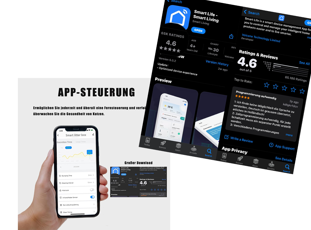 App control: Remote control with various working modes such as induction cleaning, regular cleaning, one-button cleaning, and sleep mode. Monitor cat's weight, toilet time, frequency, and health status.
