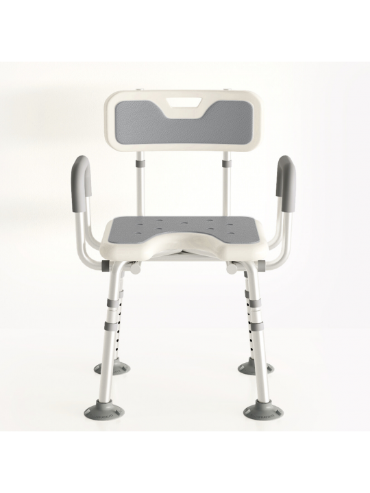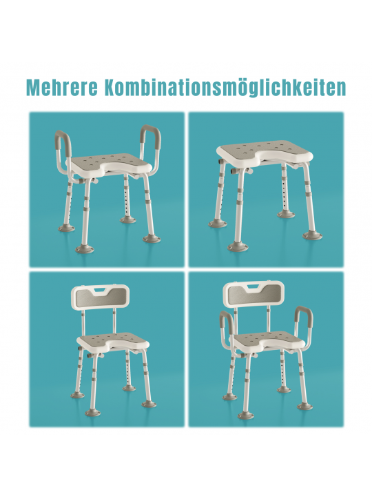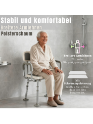 • 【Montaje libre】: La silla de baño viene con reposabrazos y respaldo desmontables, así podrás adaptarla a tus necesidades en cada momento. Ya prefieras un apoyo total o más espacio, el cambio se hace en segundos. Además, la altura se regula en 6 posiciones para adaptarse a cualquier estatura y garantizar siempre el máximo confort bajo la ducha.