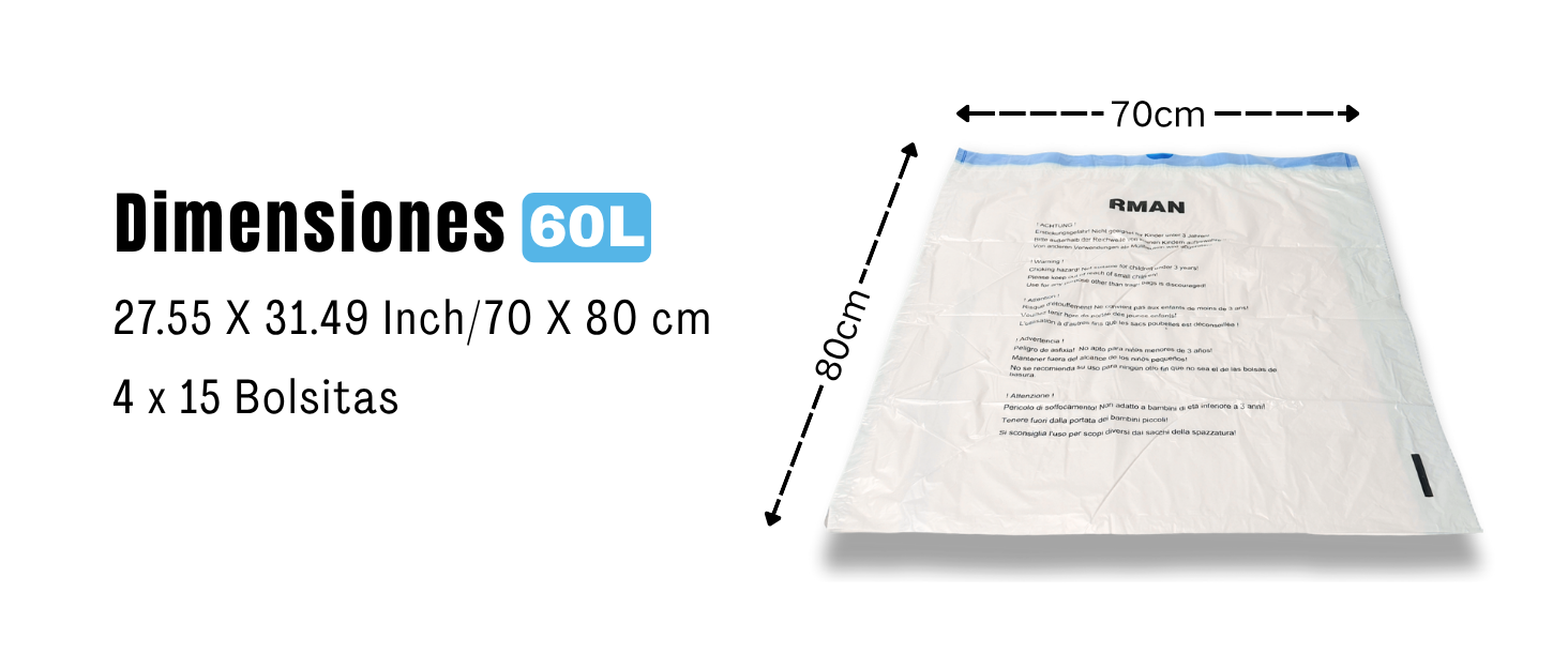 - Especificaciones: Cada bolsa de basura mide 70 x 80 cm y tiene una capacidad de 60 litros. El paquete contiene 4 rollos de bolsas de basura con 15 bolsas cada uno, para un total de 60 bolsas.