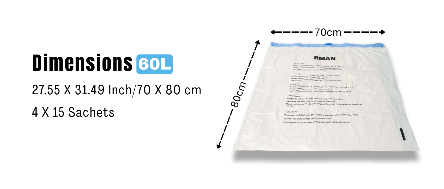 - Caractéristiques : Chaque sac poubelle mesure 70 x 80 cm et a une capacité est d'environ 60-70 litres. Le paquet contient 4 rouleaux de 15 sacs, soit 60 sacs au total.