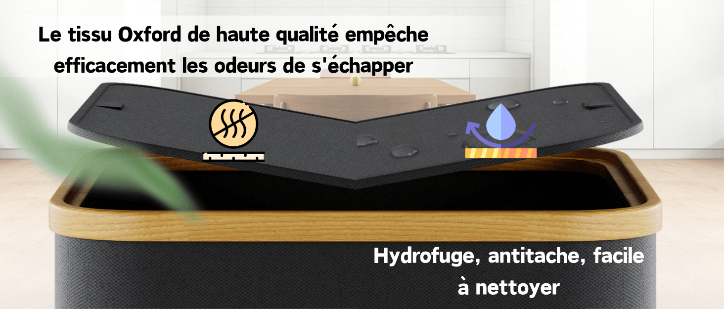 【Écologique】Fabriquée en tissu Oxford 600D de haute qualité, elle est durable, imperméable et résistante aux taches. Ses bords sont renforcés par une armature en bambou robuste et stabilisés par des barres de support. L'ouverture est doublée de similicuir pour prévenir les odeurs. Sa durabilité en fait un choix idéal pour la cuisine et la maison!