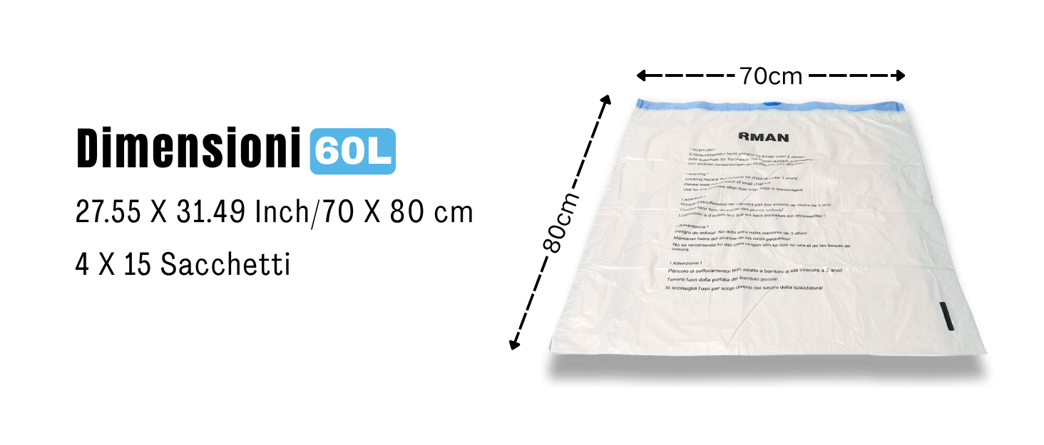 - Specifiche: Ogni busta per rifiuti misura 70 x 80 cm e ha una capacità di 60 litri. La confezione contiene 4 rotoli di buste per rifiuti con 15 buste ciascuno, per un totale di 60 buste.