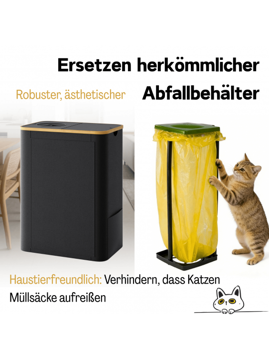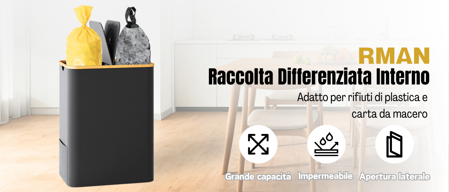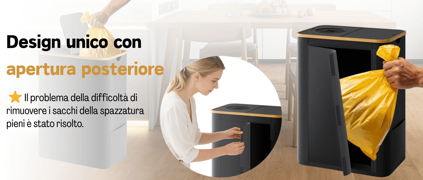 【Robusto e pieghevole】: Capiente, si piega in pochi secondi e include sacchi già inseriti. Perfetto se hai animali: impedisce graffi e strappi al sacco. Utilizzabile per bottiglie riciclabili, rifiuti generici, buste di plastica o il classico “sacco giallo”.